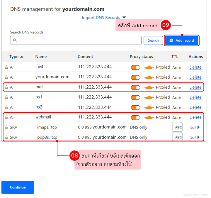 ระบบจะมาหน้าที่ DNS records จากนั้นให้ทำการลบค่าอีเมลเดิมของเก่าทิ้งไป จากนั้นคลิกที่ Add Record เพื่อเพิ่มค่า DNS ของ Microsoft 365 ลงไป