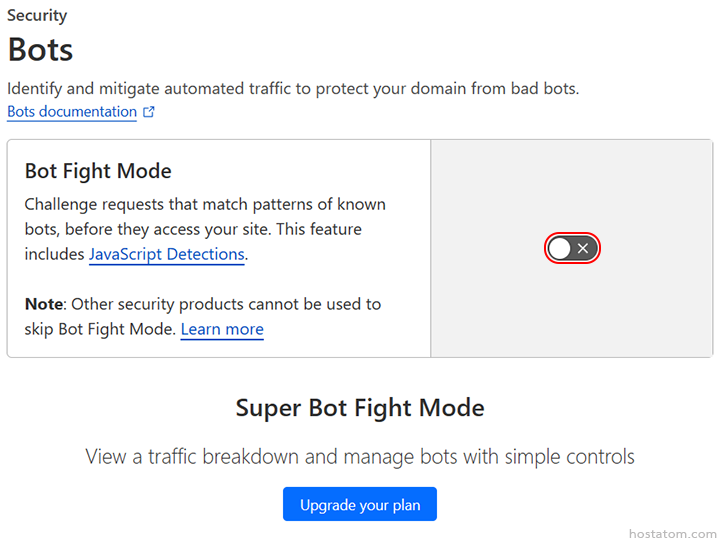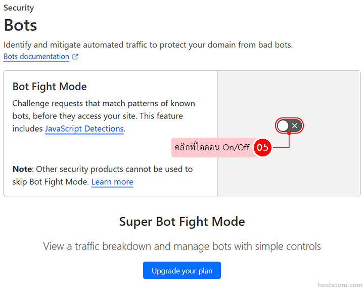 หากที่ไอคอน On/Off แสดงเป็นสีเทาดังภาพตัวอย่าง หมายความว่าระบบได้ปิดใช้งาน Bot Fight Mode แล้ว