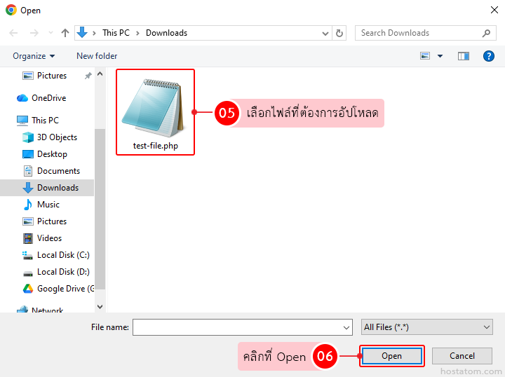 เลือกไฟล์ที่ต้องการอัปโหลด จากนั้นคลิกที่ Open