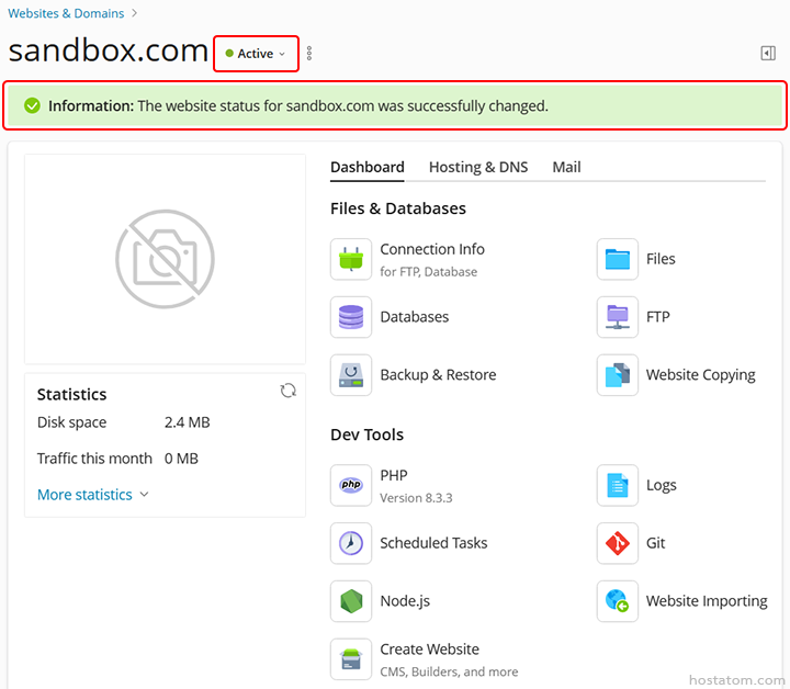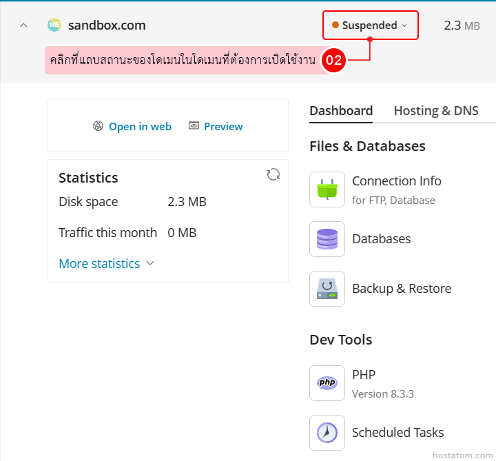 ระบบจะแจ้งว่าได้ดำเนินการเปลี่ยนสถานะของโดเมนดังกล่าวแล้ว โดยแถบสถานะของโดเมนดังกล่าวจะเปลี่ยนจาก Suspended เป็น Active ดังภาพตัวอย่าง