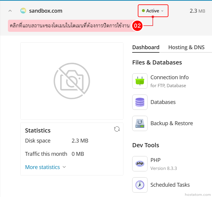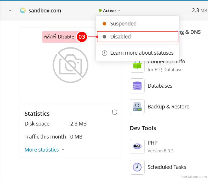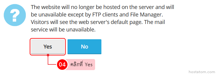 หมายเหตุ : เมื่อปิดใช้งานโดเมนแล้วเว็บไซต์ของผู้ใช้จะไม่โฮสต์อยู่บนเซิร์ฟเวอร์และไม่สามารถใช้งานได้ (ยกเว้น FTP และ File Manager) โดยผู้ที่จะเข้าชมเว็บไซต์จะเห็นหน้าเว็บเป็นหน้าเริ่มต้นของเว็บเซิร์ฟเวอร์