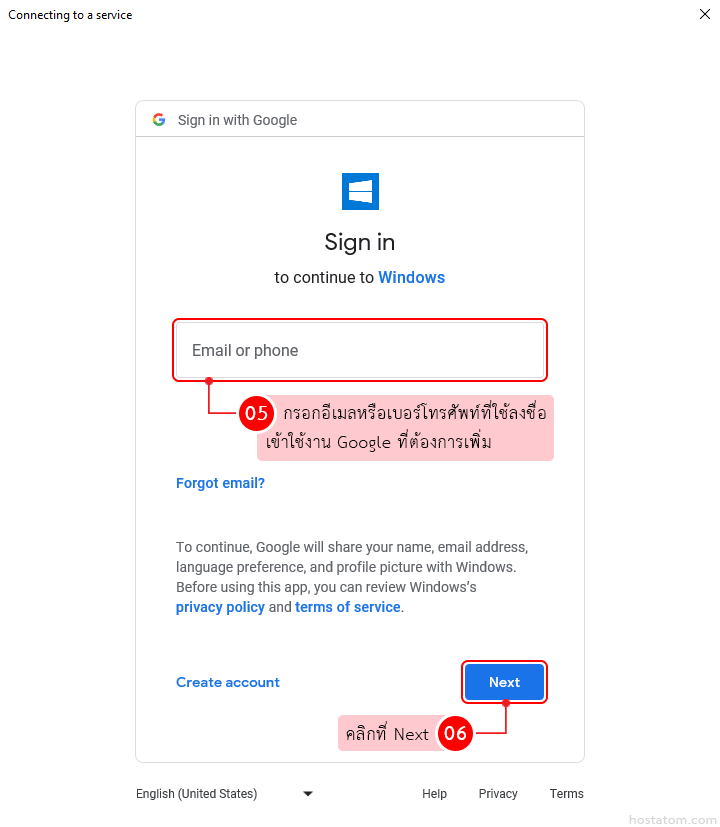 กรอกอีเมลหรือเบอร์โทรศัทพ์ที่ใช้ลงชื่อเข้าใช้งาน Google ที่ต้องการเพิ่ม จากนั้นคลิกที่ Next