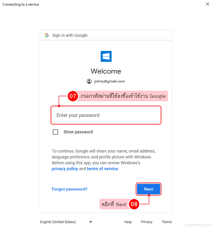 กรอกรหัสผ่านที่ใช้ลงชื่อเข้าใช้งาน Google จากนั้นคลิกที่ Next
