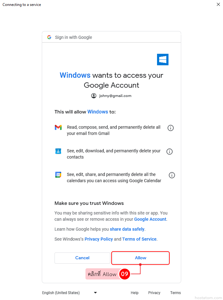 ระบบจะขอการเข้าถึงข้อมูลต่างๆ ในบัญชี Google ให้คลิกที่ Allow