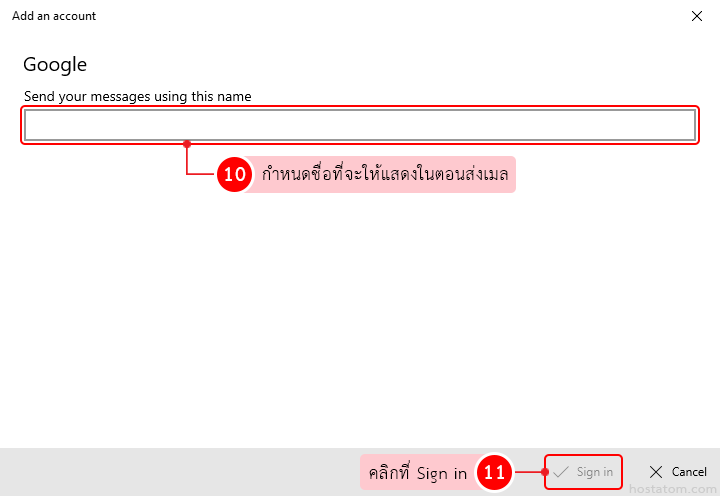 กำหนดชื่อที่จะให้แสดงในตอนส่งเมล จากนั้นคลิกที่ Sign in