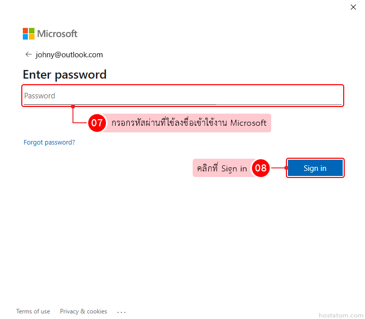 กรอกรหัสผ่านที่ใช้ลงชื่อเข้าใช้งาน Microsoft จากนั้นคลิกที่ Sign in