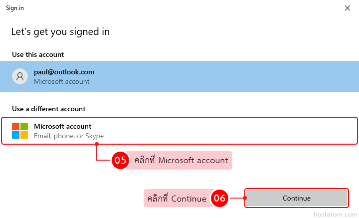 คลิกที่ Microsoft account จากนั้นคลิกที่ Continue