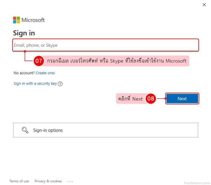กรอกอีเมล เบอร์โทรศัพท์ หรือ Skype ที่ใช้ลงชื่อเข้าใช้งาน Microsoft จากนั้นคลิกที่ Next