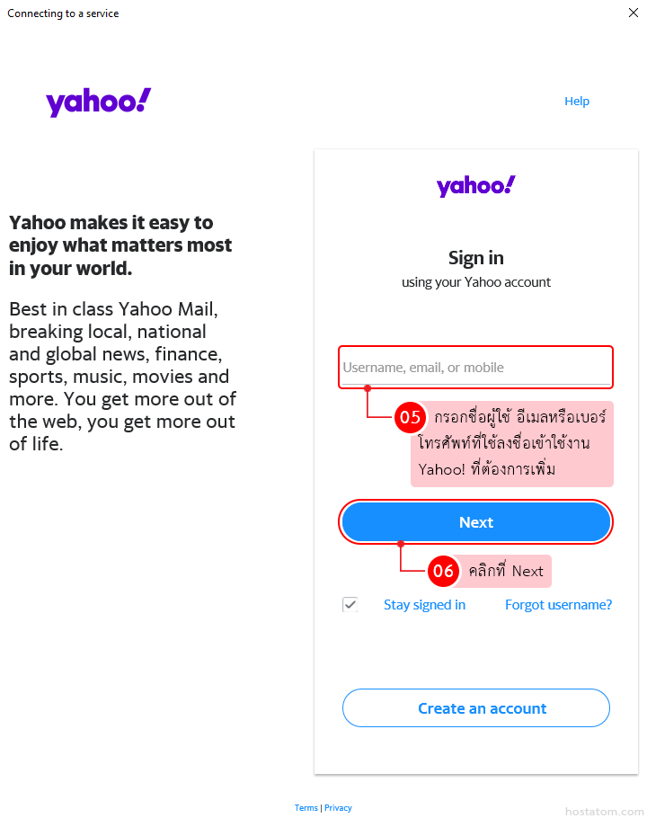 กรอกชื่อผู้ใช้ อีเมลหรือเบอร์โทรศัพท์ที่ใช้ลงชื่อใช้งาน Yahoo! ที่ต้องการเพิ่ม จากนั้นคลิกที่ Next