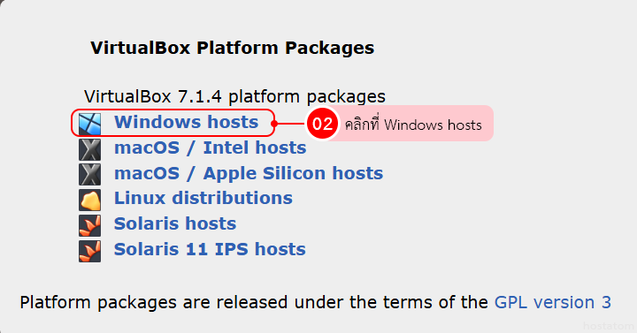 เมื่อเข้าไปที่เว็บไซต์แล้ว สามารถกดไปที่ดาวน์โหลด (Downloads) จากนั้นในส่วน VirtualBox 7.1.4 platform packages ให้เราเลือก Windows hosts