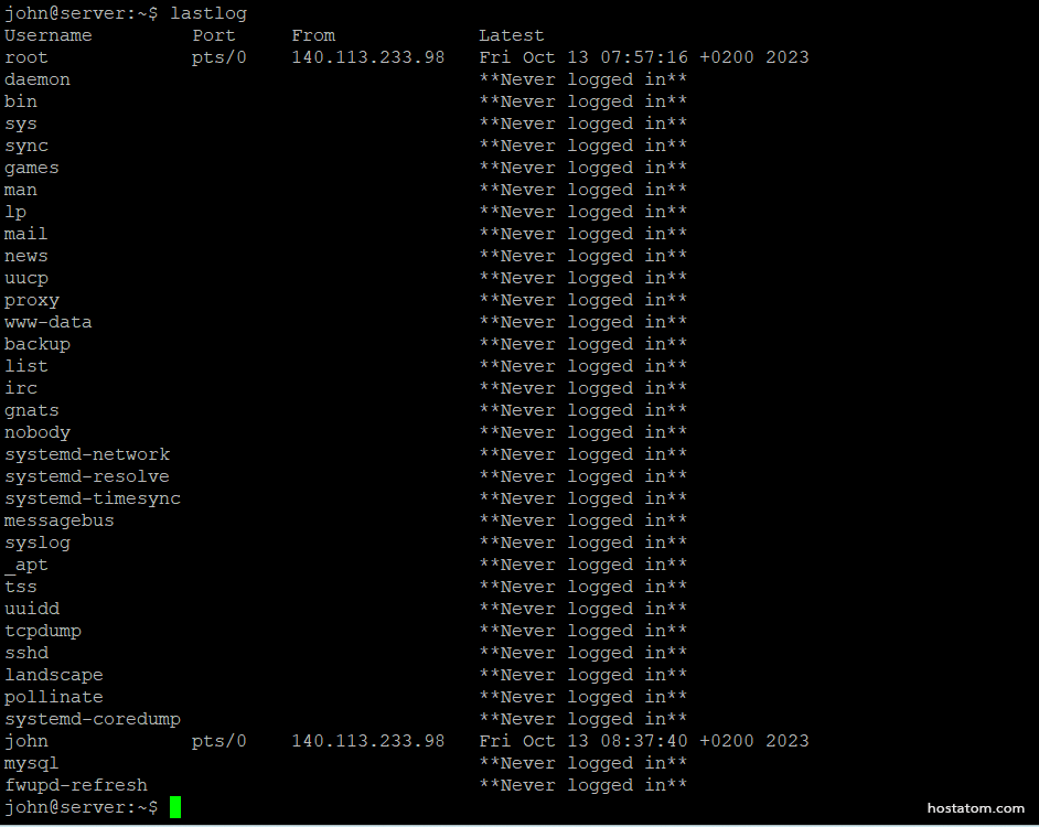 เป็นคำสั่งที่แสดงให้เห็นถึงระยะเวลาในการเข้าสู่ระบบของผู้ใช้แต่ละคน โดยข้อมูลนี้จะถูกจัดอยู่ที่ตำแหน่ง /etc/log/lastlog file โดยเรียงตามรายการในไฟล์ /etc/passwd