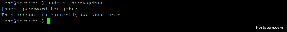 ค่าสุดท้ายคือการรันคำสั่งเมื่อล็อกอินสำเร็จ ในกรณีนี้ ค่าจะถูกตั้งเป็น /usr/sbin/nologin หากพยายามเปลี่ยนไปใช้ผู้ใช้ Messagebus โดยใช้ sudo su จะเกิดความล้มเหลว