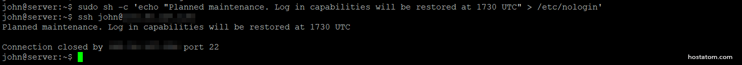 วิธีนี้จะช่วยป้องกันไม่ให้บัญชีใด ๆ ที่ไม่มีสิทธิ์ผู้ใช้ระดับสูงเข้าสู่ระบบ ด้วยไฟล์ /etc/nologin ที่ว่างเปล่า สิ่งนี้เป็นเพียงการทิ้งให้ผู้เข้าใช้กลับไปที่ shell ในเครื่องโดยไม่มีคำอธิบายใด ๆ หรือสามารถเพิ่มข้อความว่าการเข้าสู่ระบบล้มเหลวได้