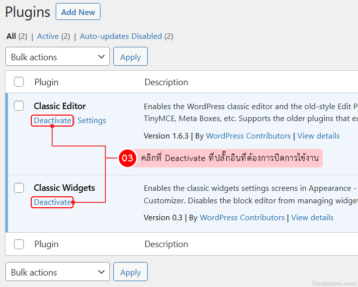 คลิกที่ Deactivate ที่ปลั๊กอินที่ต้องการปิดการใช้งาน