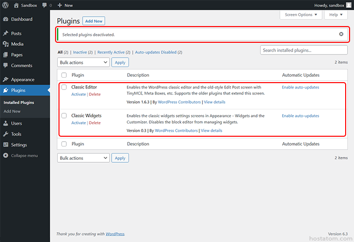 ระบบจะแจ้งว่าได้ปิดการใช้งานปลั๊กอินที่เลือกแล้ว