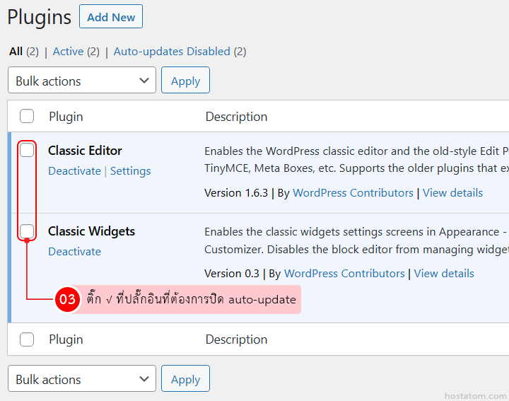 ติ๊กถูกที่ปลั๊กอินที่ต้องการปิด auto-update