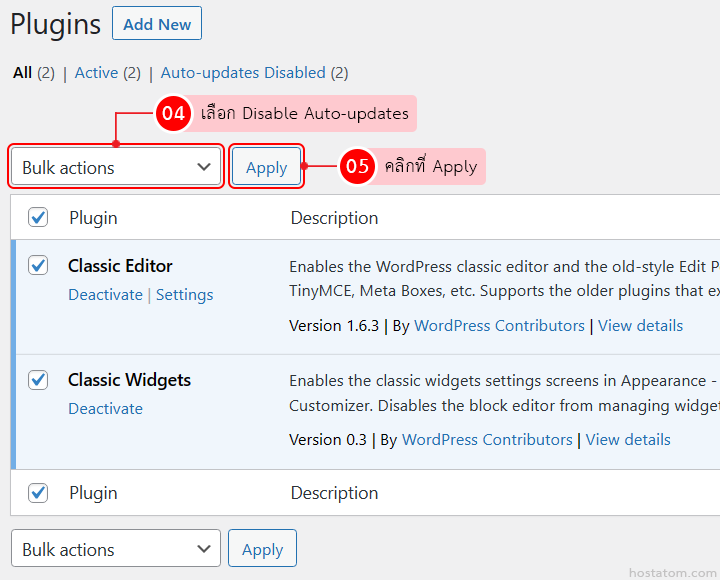 สำหรับผู้ที่ใช้งาน WordPress สามารถกลับมาปิดใช้งาน auto-update ให้กับปลั๊กอินที่เคยเปิด auto-update ไว้ได้ตามขั้นตอนต่อไปนี้