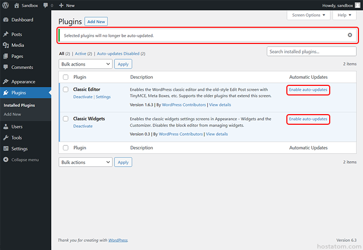 ระบบจะแจ้งว่าได้ปิด auto update ของปลั๊กอินที่เลือกแล้ว โดยที่หัวข้อ Automatic Updates ของปลั๊กอินดังกล่าวจะเปลี่ยนเป็น Enable auto-updates ดังภาพตัวอย่าง