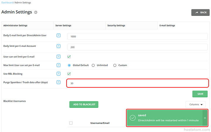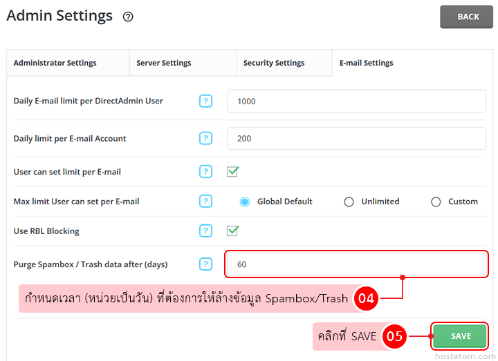 กำหนดเวลา (หน่วยเป็นวัน) ที่ต้องการให้ล้างข้อมูล Spambox/Trash ในหัวข้อ Purge Spambox/Trash data after (days) จากนั้นคลิกที่ Save