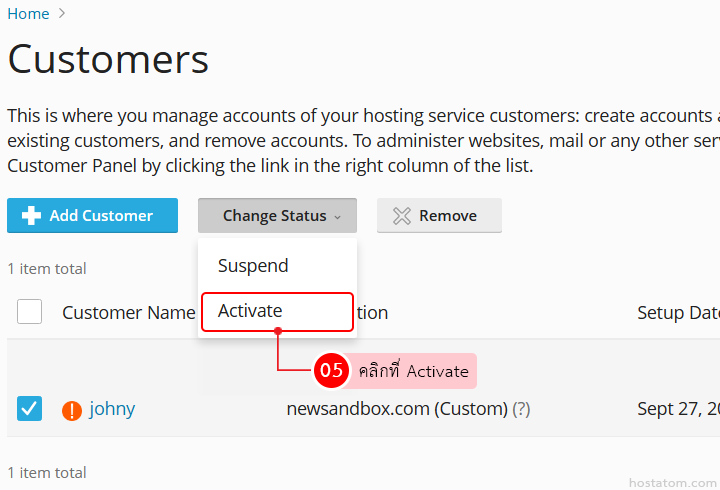 สำหรับผู้ที่ใช้งาน control panel ของ Plesk ในระดับ reseller สามารถเปิดใช้งานบัญชี customer ที่ถูกระงับการใช้งานได้ตามขั้นตอนต่อไปนี้