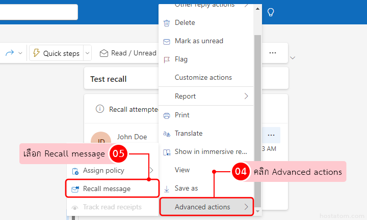 เลื่อนลงมาจนพบคลิกที่เมนู Advanced actions แล้วคลิกที่ Recall message
