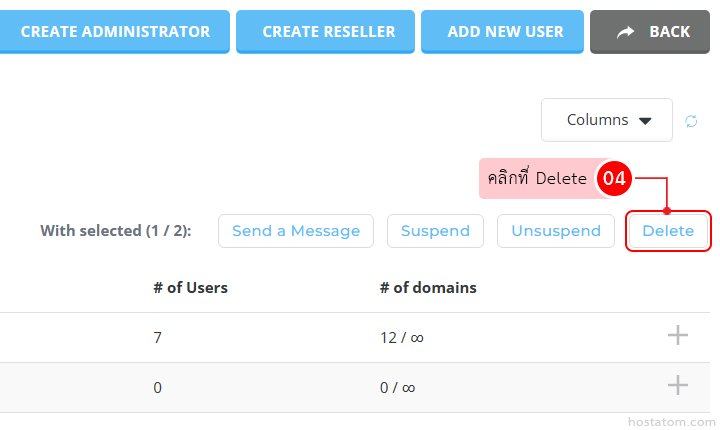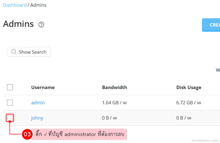 ติ๊กถูกที่บัญชี administrator ที่ต้องการลบ