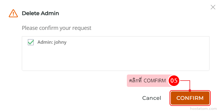 ระบบจะแสดงหน้าต่างยืนยันการลบบัญชี administrator ขึ้นมา ให้คลิกที่ CONFIRM