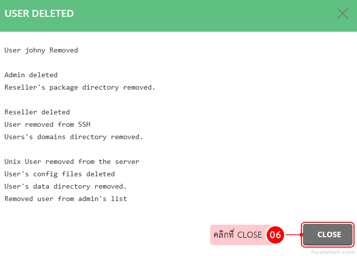 ระบบจะแจ้งว่าได้ดำเนินการลบบัญชี administrator ดังกล่าวแล้ว ให้คลิกที่ CLOSE เพื่อปิดหน้าต่างแจ้งเตือน