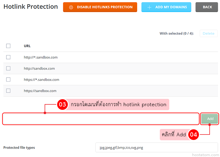 กรอกโดเมนที่ต้องการทำ hotlink protection จากนั้นคลิกที่ Add