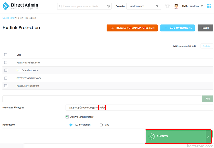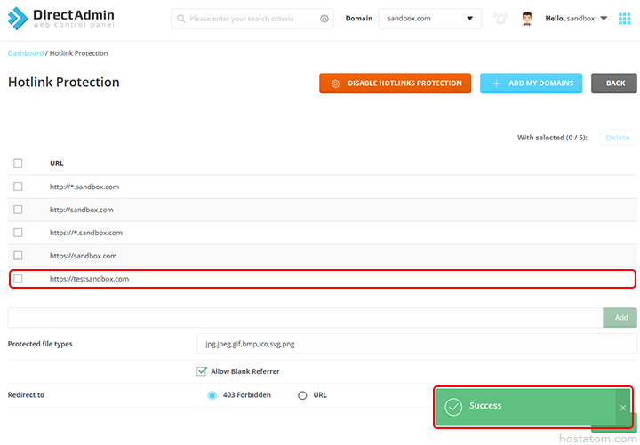 ระบบจะแจ้งว่าได้เพิ่มโดเมนดังกล่าวไว้ใน hotlink protection แล้ว