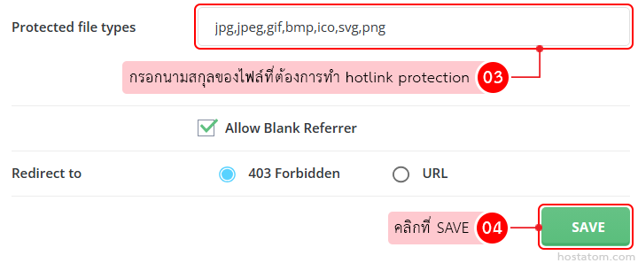 กรอกนามสกุลของไฟล์ที่ต้องการทำ hotlink protection ในหัวข้อ Protected file types จากนั้นคลิกที่ SAVE