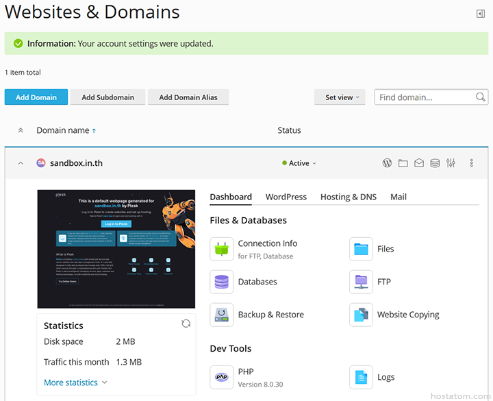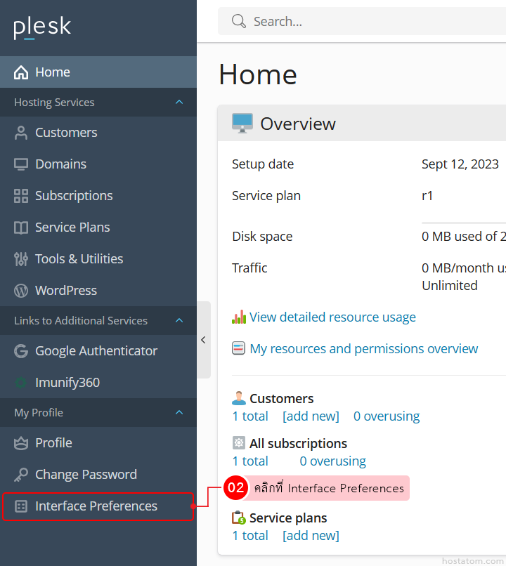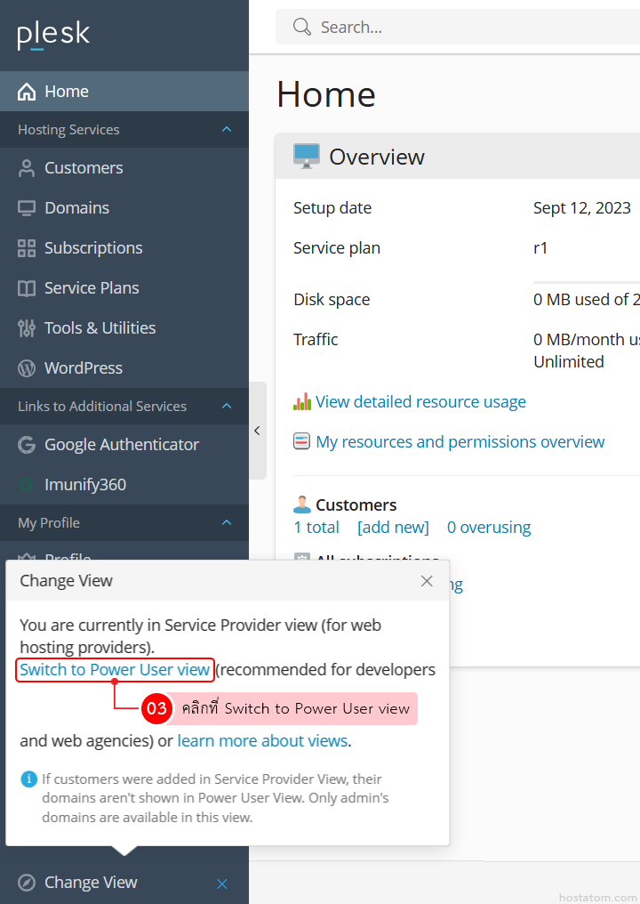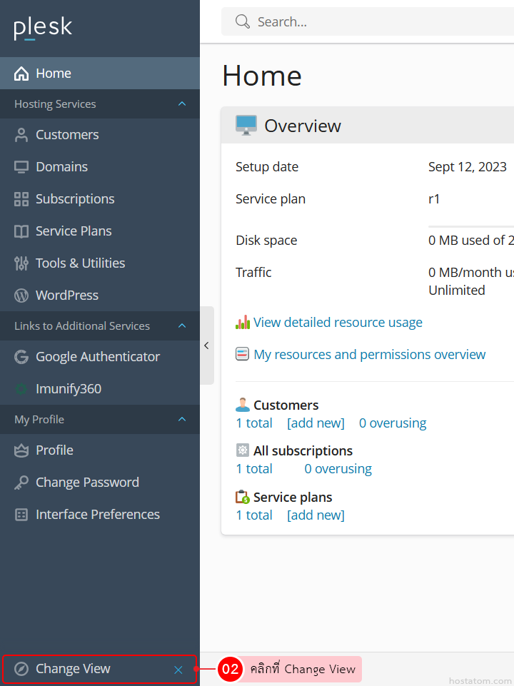 สำหรับผู้ที่ใช้งาน control panel ของ Plesk ในระดับ reseller สามารถเปลี่ยนหน้าอินเทอร์เฟซเป็นมุมมองของผู้ใช้ได้ตามขั้นตอนต่อไปนี้