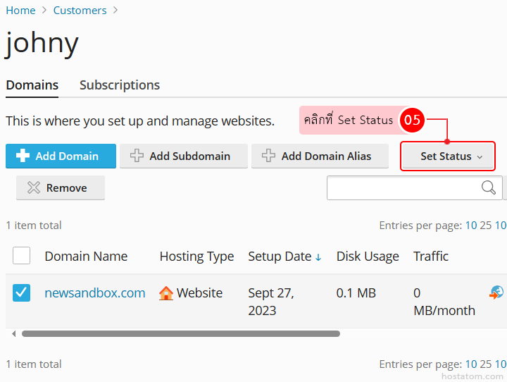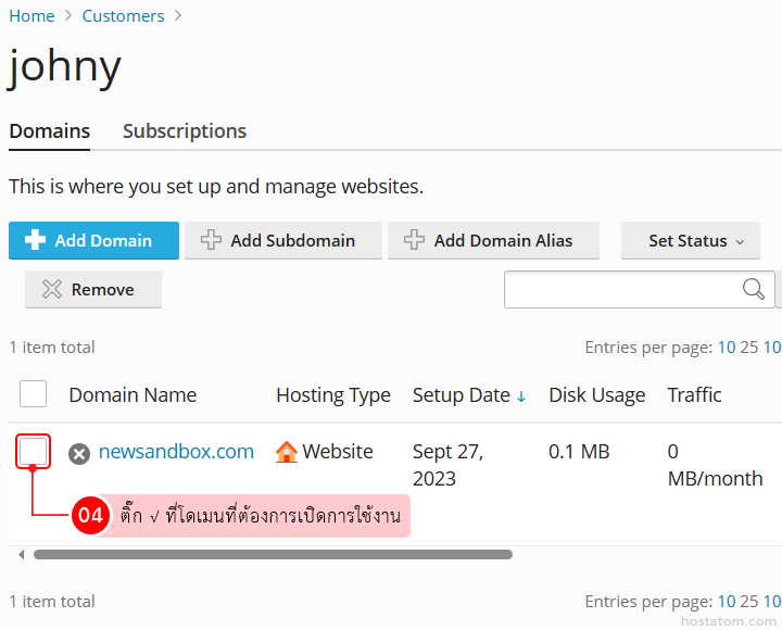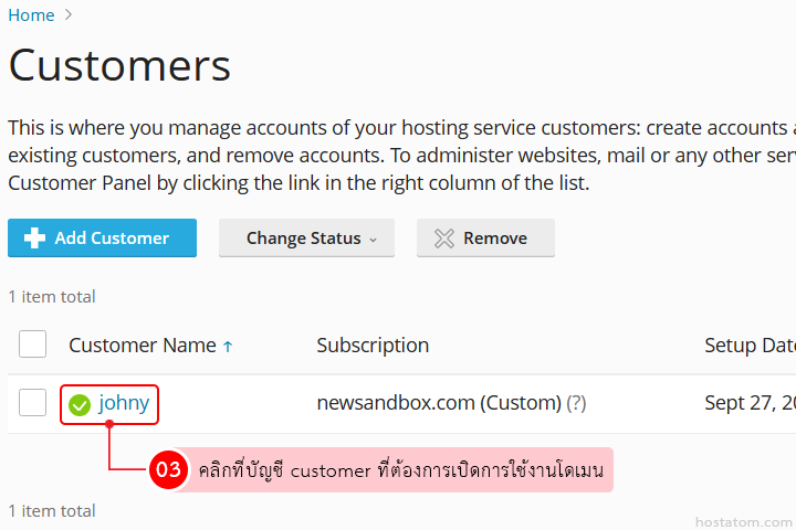 คลิกที่บัญชี customer ที่ต้องการเปิดการใช้งานโดเมน