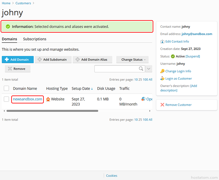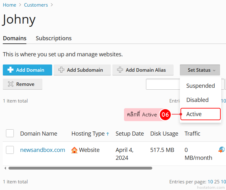 ระบบจะแจ้งว่าได้เปิดการใช้งานโดเมนดังกล่าวแล้ว โดยไอคอน disabled หรือ suspended ที่หน้าชื่อโดเมนจะหายไปดังภาพตัวอย่าง