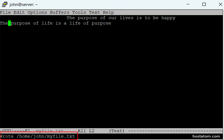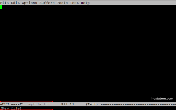 ใส่ชื่อไฟล์เพื่อเริ่มแก้ไขข้อความ ในตัวอย่างต่อไปนี้ จะใช้ myfile.txt คุณสามารถตั้งชื่อไฟล์นี้ตามที่ต้องการ เมื่อพิมพ์ชื่อไฟล์แล้ว ให้กด ENTER เพื่อดำเนินการต่อ จะปรากฎไฟล์ว่างที่พร้อมสำหรับการพิมพ์ข้อความใหม่