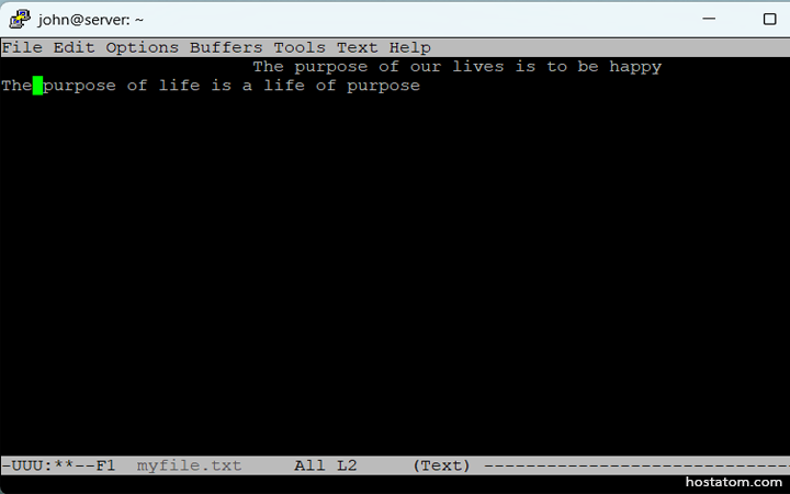 เพื่อยกตัวอย่าง สามารถเขียนแอป “Hello World” ใน Python โดยใช้ Emacs ภายในเทอร์มินัลและในไฟล์หลัก ให้ป้อนคำสั่งต่อไปนี้