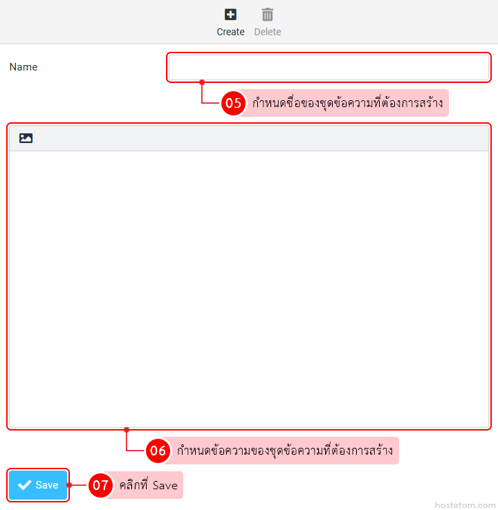 กำหนดชื่อของชุดข้อความที่ต้องการสร้างในหัวข้อ Name และกำหนดข้อความของชุดข้อความที่ต้องการสร้าง จากนั้นคลิกที่ Save
