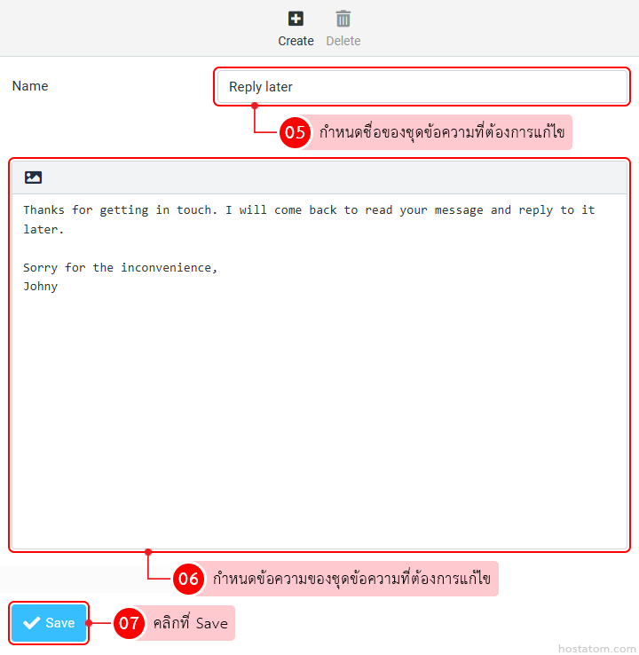 กำหนดชื่อของชุดข้อความที่ต้องการแก้ไขในหัวข้อ Name หรือกำหนดข้อความของชุดข้อความที่ต้องการแก้ไข จากนั้นคลิกที่ Save