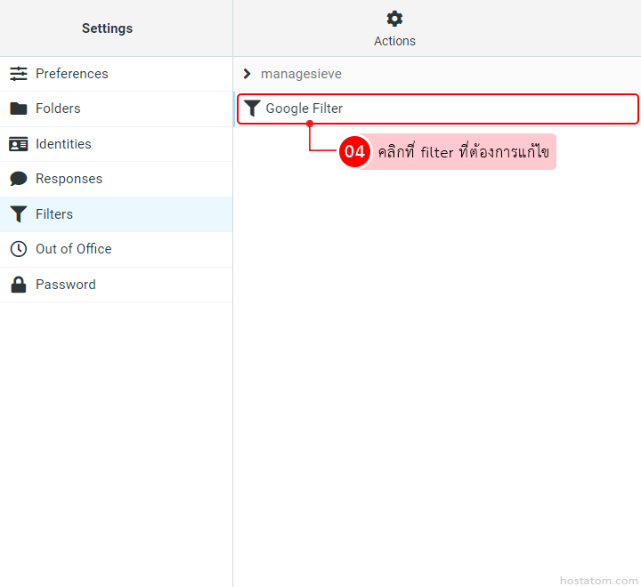 สำหรับผู้ที่ใช้งานบริการอีเมลของ Roundcube Webmail สามารถแก้ไขการตั้งค่าของ filter ที่มีอยู่ได้ตามขั้นตอนต่อไปนี้