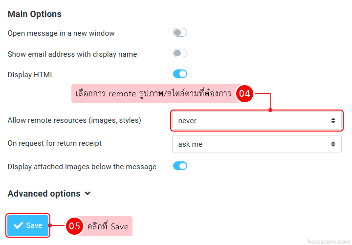 เลือกการ remote รูปภาพ/สไตล์ในหัวข้อ Allow remote resources (images, styles) จากนั้นคลิกที่ Save