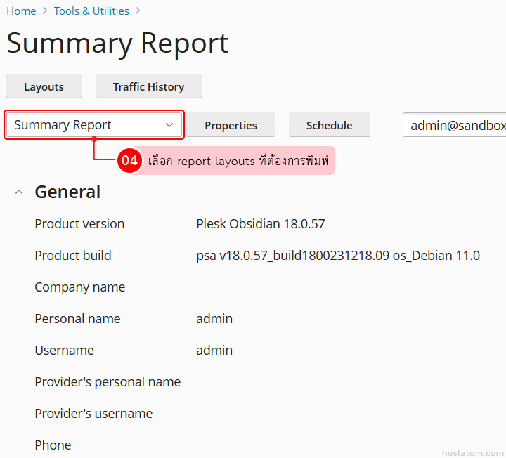 วิธีพิมพ์รายงานการใช้งานทรัพยากรสำหรับ admin ใน Plesk