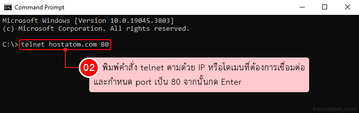 พิมพ์คำสั่ง telnet ตามด้วย IP หรือโดเมนที่ต้องการเชื่อมต่อ และกำหนด port เป็น 80 จากนั้นกด Enter