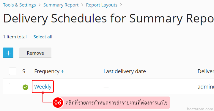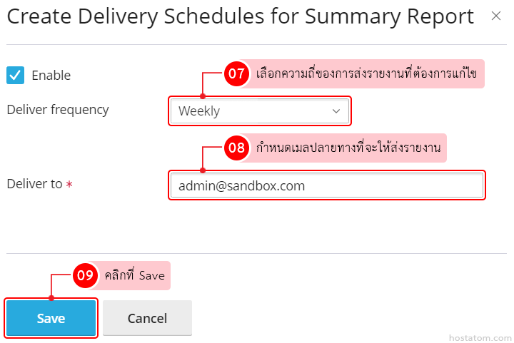 เลือกความถี่ของการส่งรายงานที่ต้องการแก้ไขในหัวข้อ Delivery frequency และกำหนดเมลปลายทางที่จะให้ส่งรายงานในหัวข้อ Delivery to จากนั้นคลิกที่ Save