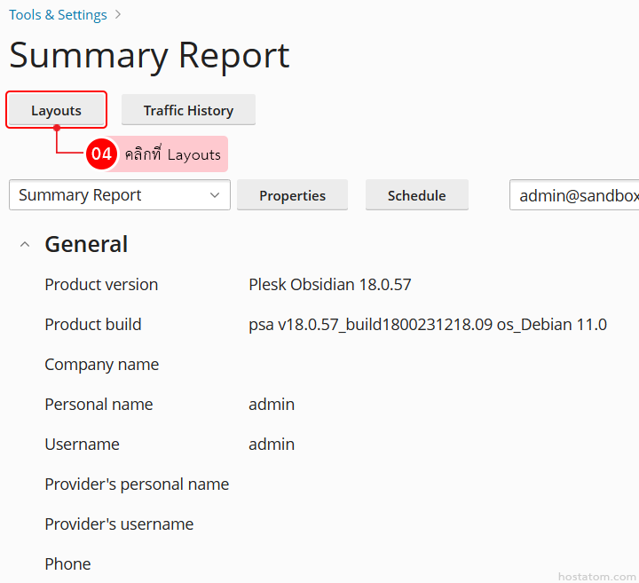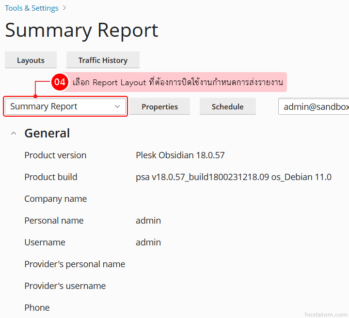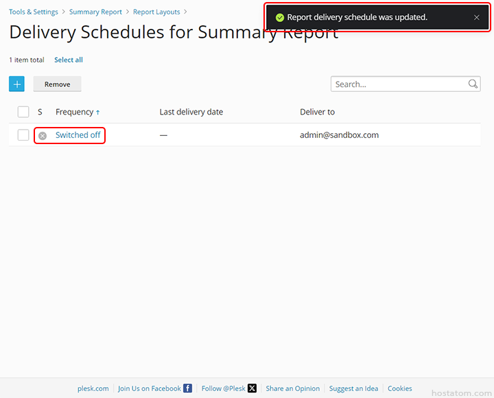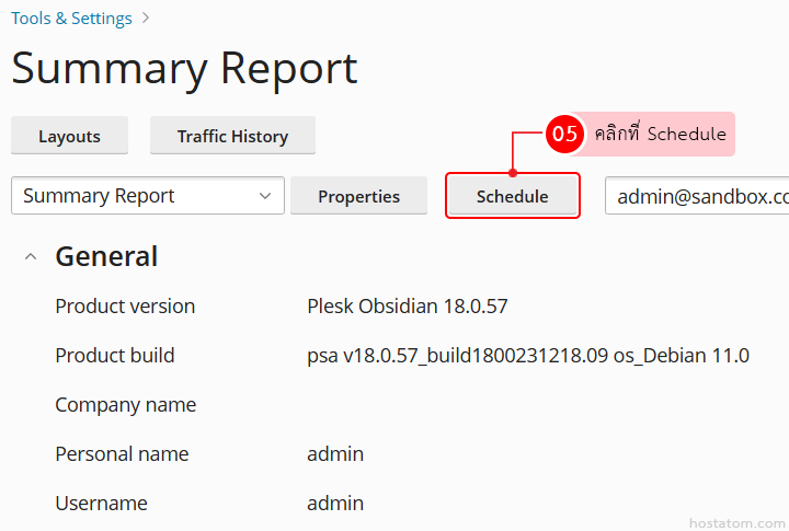 วิธีปิดการใช้งานกำหนดการส่งรายงานการใช้งานทรัพยากรสำหรับ admin ใน Plesk