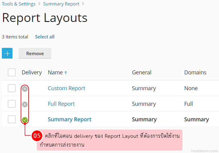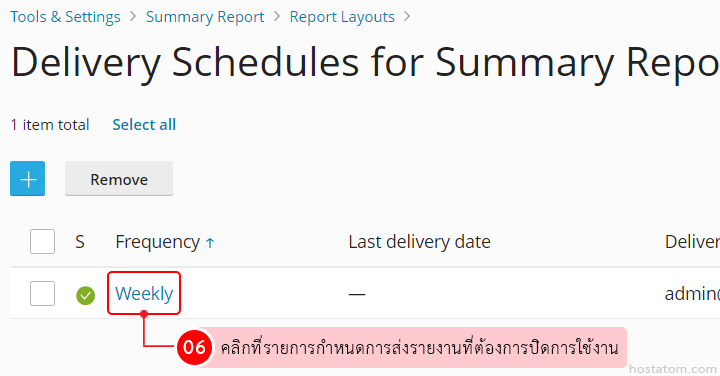 คลิกที่ไอคอน delivery ของ Report Layout ที่ต้องการปิดการใช้งานกำหนดการส่งรายงาน