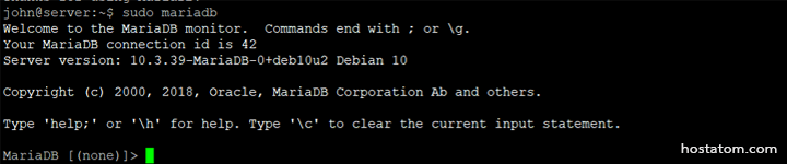 การดำเนินการนี้จะเชื่อมต่อกับเซิร์ฟเวอร์ MariaDB ในฐานะผู้ใช้ root ของฐานข้อมูลผู้ดูแลระบบ ซึ่งอนุมานได้จากการใช้ sudo เมื่อเรียกใช้คำสั่งนี้ คุณควรได้รับผลลัพธ์ดังต่อไปนี้