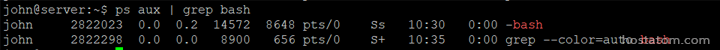 การดำเนินการนี้จะส่งคืนทั้งกระบวนการ grep ที่คุณเพิ่งรันและ shell bash ที่กำลังรันอยู่ในปัจจุบัน นอกจากนี้ยังส่งคืนหน่วยความจำและการใช้งาน CPU ทั้งหมด ระยะเวลาที่รัน และ ID กระบวนการในเอาต์พุตที่เน้นไว้ด้านบน ในระบบ Linux และ Unix แต่ละกระบวนการจะได้รับการกำหนด ID กระบวนการหรือ PID