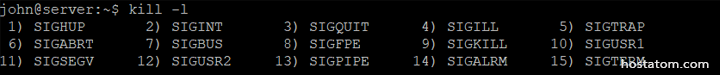 นี่คือสัญญาณพิเศษที่ไม่ได้ถูกส่งไปยังโปรแกรมโดยตรง แต่จะถูกส่งไปยังเคอร์เนลของระบบปฏิบัติการ ซึ่งจะทำการปิดกระบวนการนั้นแทน สัญญาณนี้ใช้เมื่อต้องการข้ามโปรแกรมที่ไม่ตอบสนองต่อสัญญาณที่ส่งไปถึง แต่ละสัญญาณจะมีหมายเลขกำกับ ซึ่งสามารถใช้แทนชื่อได้ เช่น คุณสามารถส่งสัญญาณ “-15” แทน “-TERM” หรือ “-9” แทน “-KILL” ได้