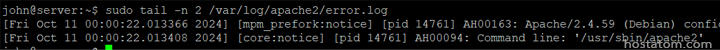 จากผลดังรูป [mpm_prefork:notice] และ [core:notice]: ข้อมูลเหล่านี้ระบุส่วนของ Apache ที่สร้างข้อความ “mpm_prefork” คือวิธีที่ Apache จัดการการเชื่อมต่อหลายรายการ และ “core” คือส่วนหลักของ Apache
