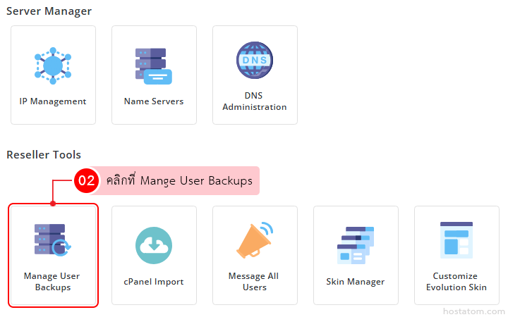 คลิกที่ Manage User Backups ในหมวด Reseller Tools
